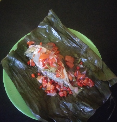 7. Kembangkan daun pisang yang sudah layu, buat dua lapis. Letakan irisan cabe yang sudah dicampur lalu beri daun ruku ruku. Letakan satu ekor ikan diatasnya. Tutup lagi pakai daun ruku ruku dan irisan cabe tadi. Tutup. Semat ujung-ujungnya.