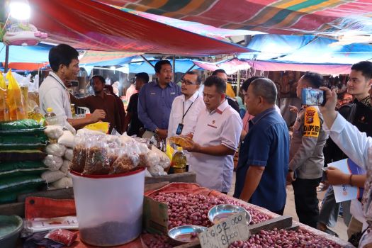 Kombes Nasriadi yang didampingi sejumlah pejabat utama Polda Riau, Wakapolres Dumai, perwakilan Bulog, serta petugas dari Polres Dumai, mendatangi sejumlah lapak pedagang untuk mengetahui harga terkini berbagai komoditas pangan.