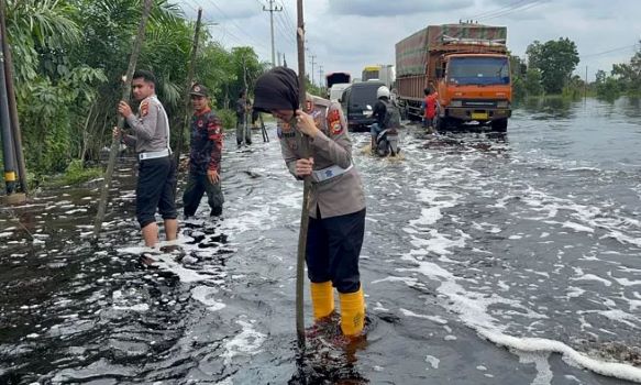 Jalintim Mulai Banjir, Polres Pelalawan Pasang Pancang sebagai Rambu-Rambu Jalan