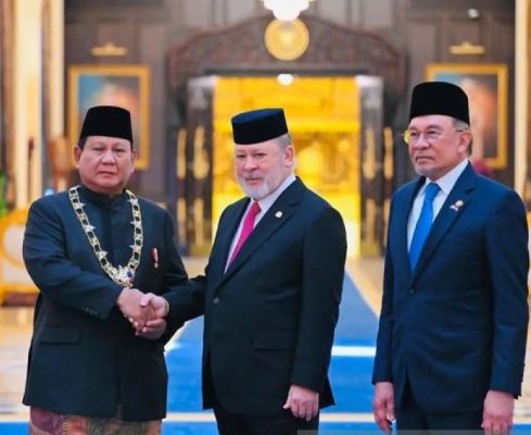BNEWS - Presiden Prabowo Subianto diberikan penghargaan Darjah Kerabat Johor Yang Amat Dihormati Pangkat Pertama (D.K I Johor) dari Malaysia dan diserahkan langsung Yang di-Pertuan Agong XVII Sultan Ibrahim di Istana Negara Malaysia, Senin (27/1/2025).