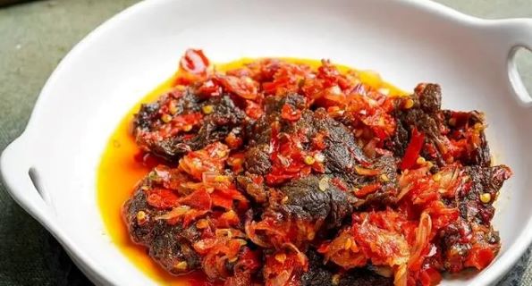 10. Masukan daging yang sudah digoreng. kecilkan api. aduk rata daging dan cabe, angkat.