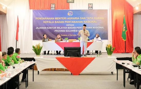 | Menteri Nusron saat memberi pengarahan ke jajaran Kantor Wilayah (Kanwil) BPN Provinsi Sulawesi Utara (Sulut), di Minahasa, Kamis (17/07/2025). |