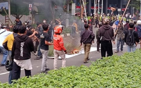 Sebelumnya, massa yang berkumpul di depan gedung DPR dipukul mundur. Massa aksi melempar sejumlah benda, seperti petasan, dan polisi mengimbau massa untuk tertib.