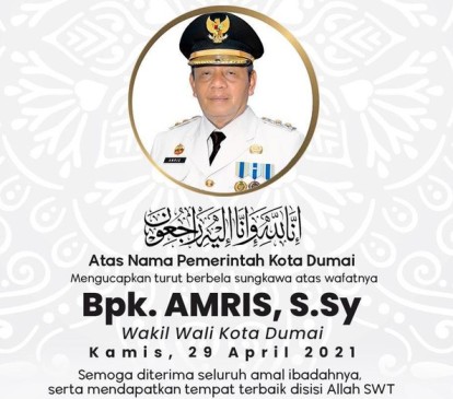 BNEWS - Kabar duka datang dari kora Dumai, Provinsi Riau. Wakil Wali Kota Dumai yang baru saja 2 bulan dilantik, Amris, meninggal dunia pada Kamis (29/4/2021) pagi sekira pukul 09.30 WIB, saat menjalani perawatan karena terkonfirmasi positif Covid-19.