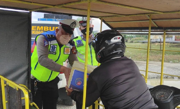 BNEWS - Satlantas Polres Rokan Hilir membagikan paket sembako kepada pedagang kaki lima, tukang becak dan beberapa warga yang terdampak Covid-19, di Jalan Lintas Bagan Batu KM 5, Kecamatan Bagan Sinembah, Sabtu (14/8/21) siang.