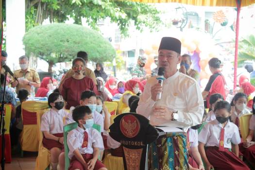 BNEWS - Bupati Rokan Hilir (Rohil) Afrizal Sintong meresmikan pelaksanaan vaksinasi serentak jajaran Polda Riau bersama pemerintah daerah se Provinsi Riau dan operasi pasar minyak goreng oleh tim penggerak PKK Kabupaten Rohil, Selasa (22/2/2022).