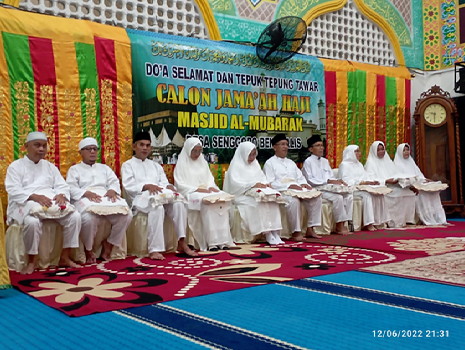 BNEWS - Pengurus Masjid Al-Mubarak Desa Senggoro, Kecamatan Bengkalis, Kabupaten Bengkalis, menggelar acara do'a selamat dan tepung tawar untuk Jama'ah Calon Haji (JCH) asal desa tersebut, Minggu malam (12/6/2022).