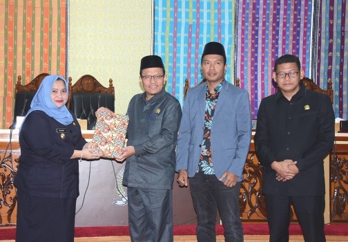 BNEWS - Bupati Bengkalis Kasmarni menyerahkan Rancangan Kebijakan Umum Anggaran (KUA) dan Priorotas Plafon Anggaran Sementara (PPAS), saat menghadiri Sidang Paripurna tentang Ranperda Pertangungjawaban APBD tahun 2021 di DPRD Bengkalis, Rabu (14/7/2022).