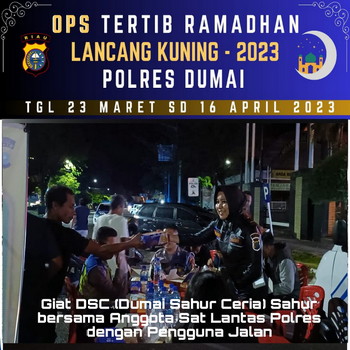"Melalui kegiatan Dumai Sahur Ceria (DSC) Satuan Lalu Lintas Polres Dumai mengajak masyarakat khususnya para pengguna jalan yang melintas untuk sahur bersama kami Jajaran Satuan Lalu Lintas Polres Dumai," ungkap AKP Akira Ceria.