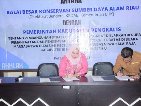 BNEWS - Bupati Bengkalis, Kasmarni, menanda tangani perjanjian kerjasama dengan Kepala Balai Konservasi Sumber Daya Alam (BKSDA) Riau Genman S.Hasibuan, Kamis (4/5/2023), di Balai Besar KSDA, Jalan Soebrantas Pekanbaru.