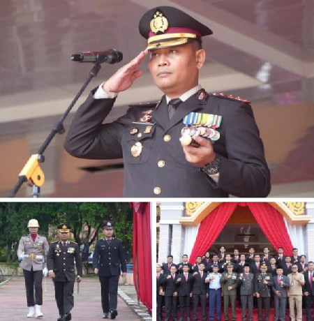 BNEWS - Polres Kuantan Singingi (Kuansing), menggelar upacara peringatan Hari Bhayangkara ke 77 tahun 2023, di Lapangan Limuno Teluk Kuantan, Kecamatan Kuantan Tengah, Kabupaten Kuansing, Sabtu (01/07/2023). Bertindak sebagai Inspektur Upacara Kapolres Kuansing AKBP Pangucap Priyo Soegito.