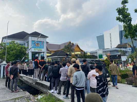 BNEWS - Massa Satuan Siswa Pemuda dan Mahasiswa Pemuda Pancasila (SAPMA PP) Indragiri Hulu (Inhu) melakukan aksi unjuk rasa di depan Kantor Pelayanan Kekayaan Negara dan Lelang (KPKNL) Pekanbaru, Kamis(02/11/23).