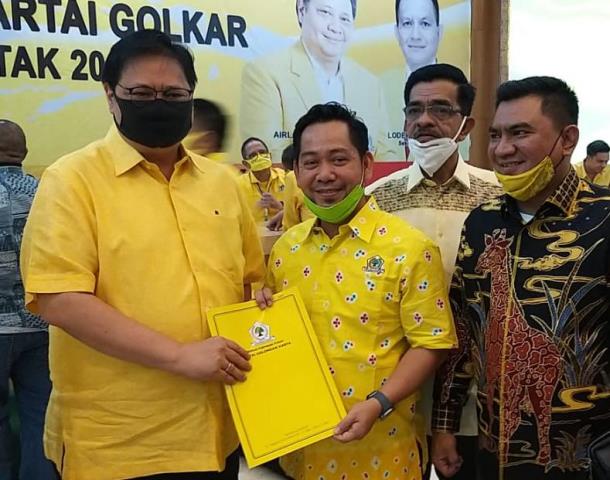 JAKARTA - Ketua Umum Dewan Pimpinan Pusat (DPP) Partai Golkar yang saat ini juga menjabat sebagai Menteri Koordinator Bidang Perekonomian, Airlangga Hartanto, menyerahkan SK kepada Adi Sukemi untuk maju di Pilkada Pelalawan.
